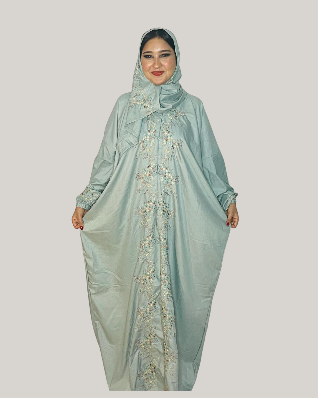 Embrace tranquility during prayer with our Floral Prayer Set. This beautiful one-piece garment in a calming light blue or mint green hue is designed for ease and modesty. It features an attached hood/hijab for full coverage and is delicately adorned with subtle floral embroidery in gentle pastel shades down the front and on the cuffs, offering both beauty and devotion.