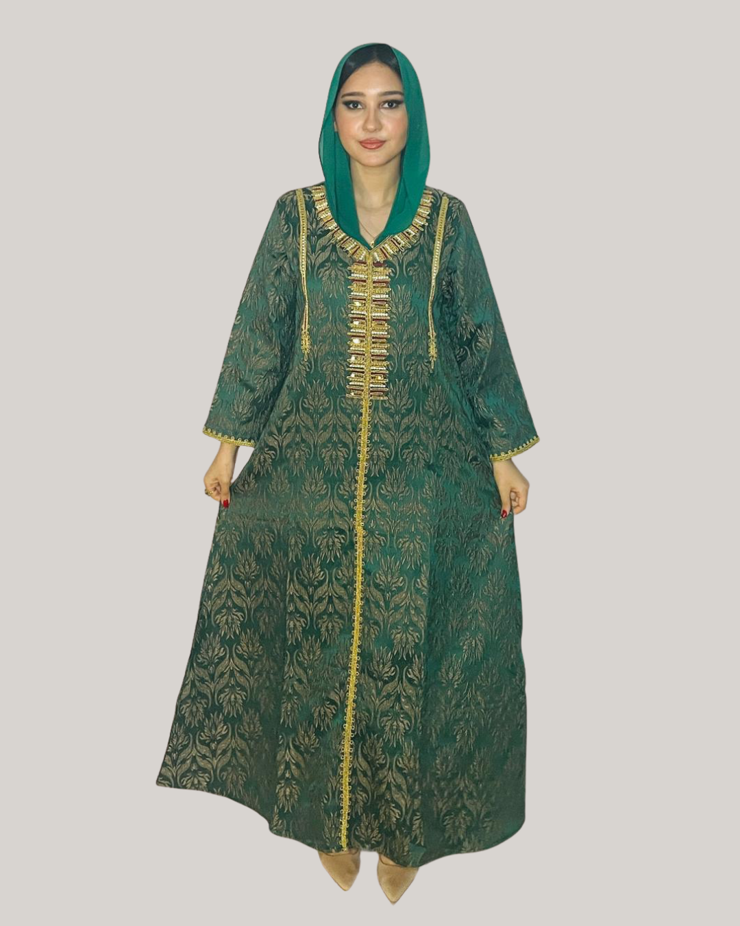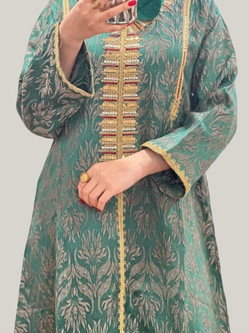 Step into regal elegance with our Unique Emerald Brocade Majesty jalabiya. Crafted from a luxurious deep green brocade, this piece shimmers with an intricate gold woven pattern that exudes sophistication. The central panel is richly adorned with dazzling gold and red beadwork, creating a truly opulent statement.