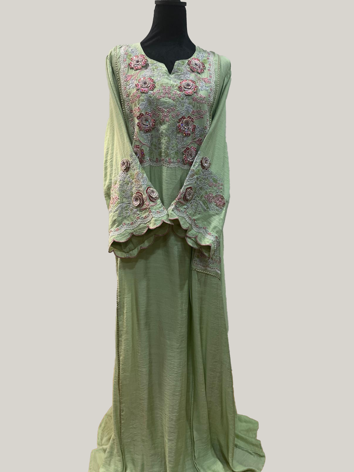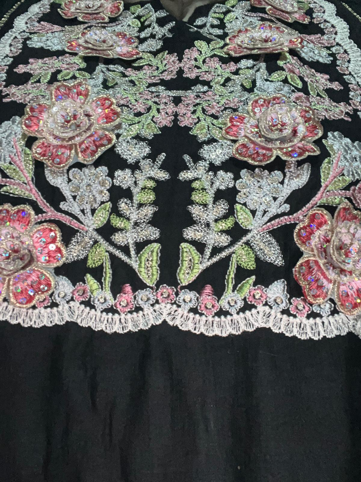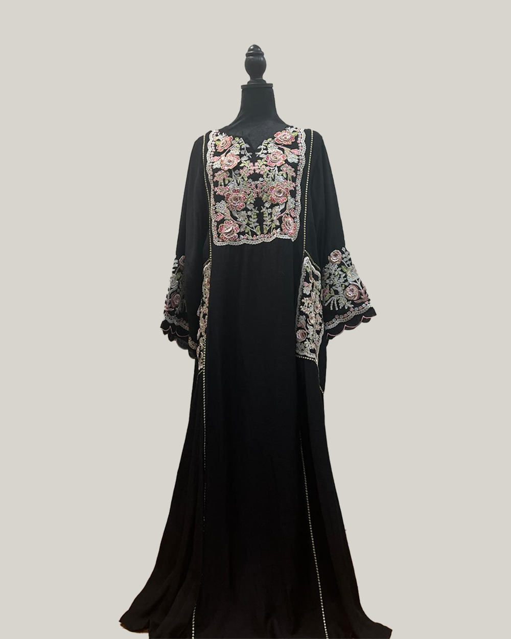 This elegant jalabiya is a sophisticated take on traditional wear, available in both black and green. The body of the garment is simple, allowing the beautiful and colorful embroidery to stand out. It features a wide-neckline and a central embroidered panel with a vibrant floral pattern in shades of pink, white, and green. The same floral motif is echoed on the sleeves, which are wide and flared, ending with a scallop-edged trim. The combination of cotton and silk materials would provide a luxurious feel with a beautiful drape, making it perfect for formal occasions or festive events.