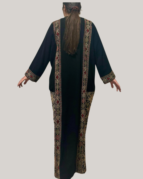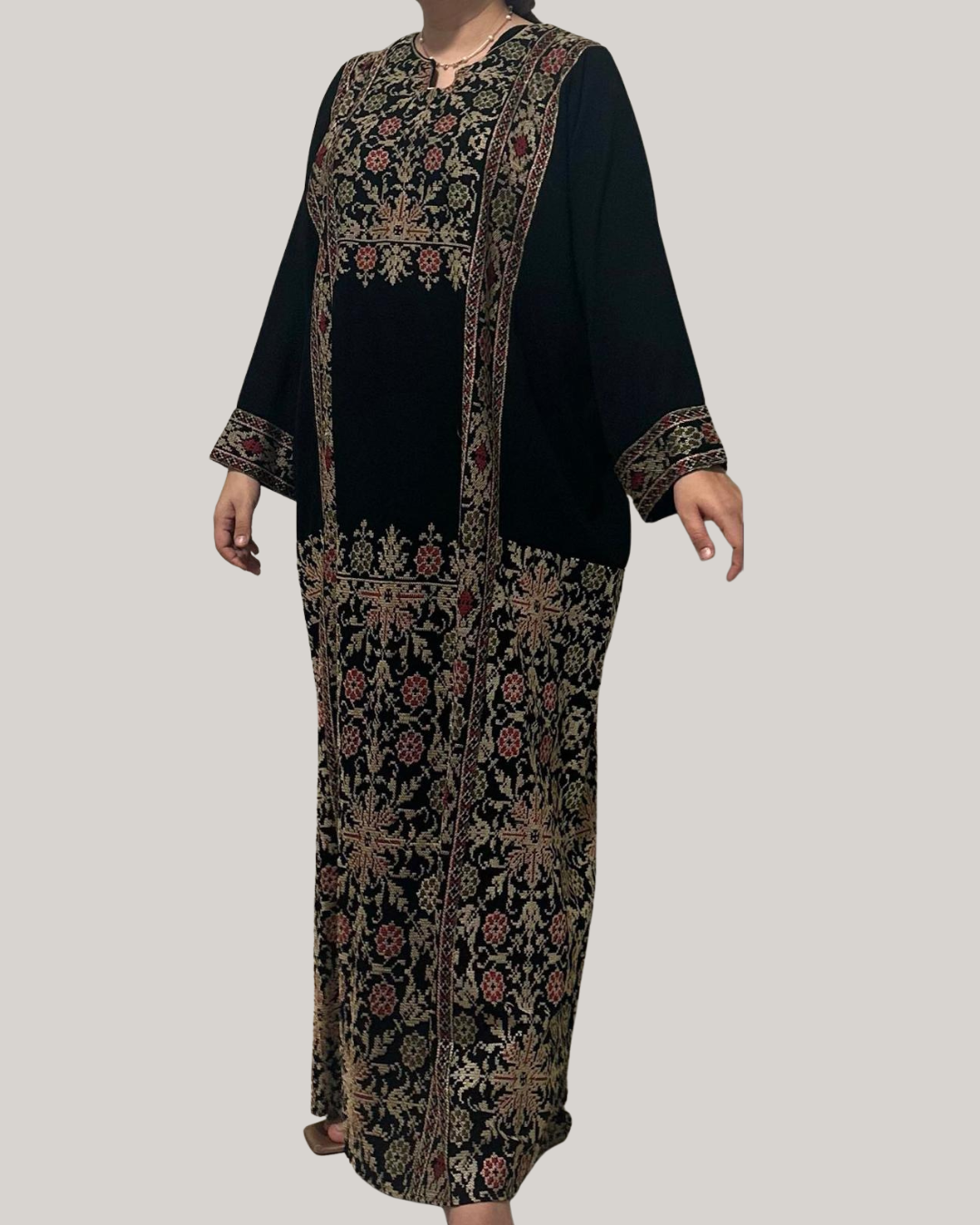 Embrace timeless tradition with our Palestinian Heritage Jalabiya. This striking black garment is exquisitely adorned with intricate cross-stitch embroidery in rich shades of red, gold, and green, showcasing classic Palestinian artistry. The vibrant patterns cover the chest, sleeves, and extend beautifully down the length of the dress, creating a statement of cultural elegance.