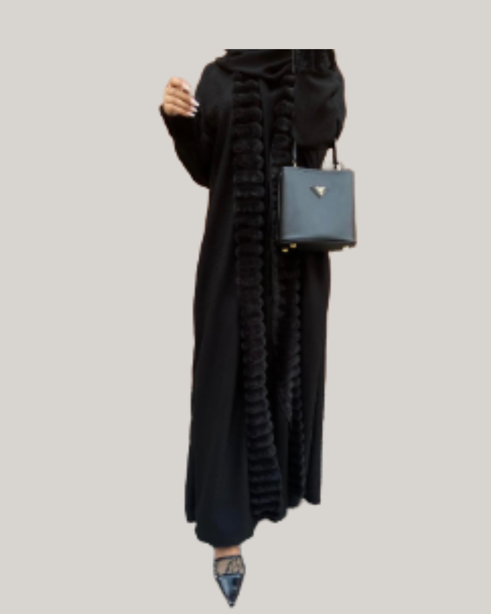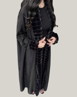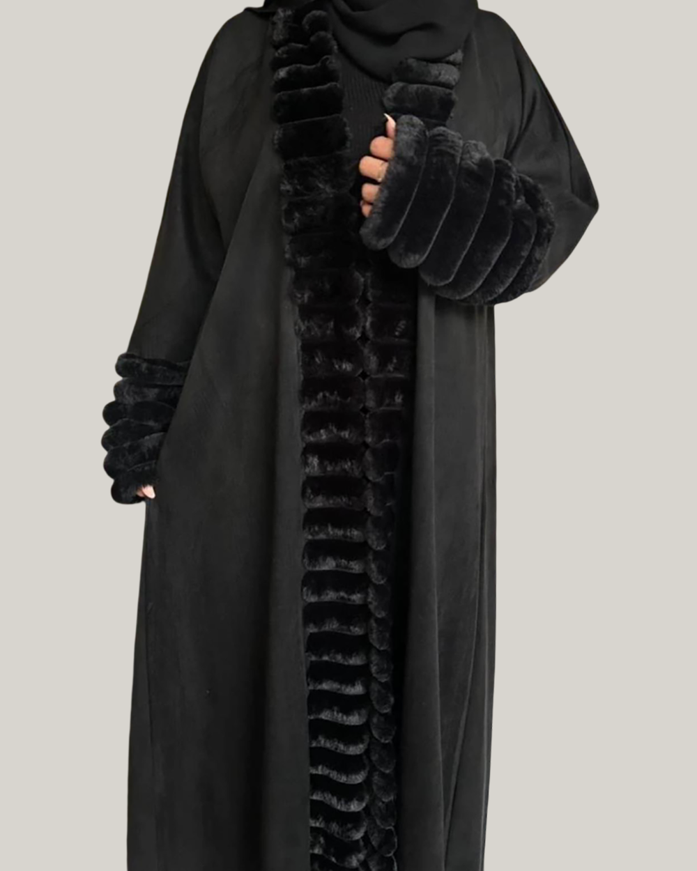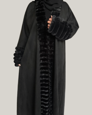 Embrace sophisticated warmth with our Velvet Whisper Abaya. This stylish korean kashmir black abaya features a luxurious design, highlighted by soft, plush black fur trim detailing along the open front and cuffs of the sleeves. The subtle texture of the main fabric combined with the elegant fur accents creates a modern and chic silhouette, offering a new take on traditional abaya designs.